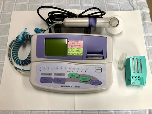 肺活量や一秒率(素早く換気を行うことが出来る機能)を測定し、気管支喘息や慢性閉塞性肺疾患(肺気腫・慢性気管支炎・びまん性細気管支炎)等の診断・評価に役立てます。又禁煙の状況を確認するため、呼気中の一酸化炭素濃度を測定することもあります。又呼吸状態の悪い方には、動脈より少量の採血をし、血液中の酸素や二酸化炭素の濃度を調べます。