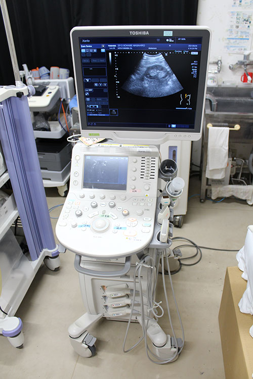 いわゆる”エコー”と呼ばれる器械です。腹部、心臓から頚動脈(→頭を養っている血管)・下肢の末梢血管に至るまで、幅広い診断・治療に対応します。